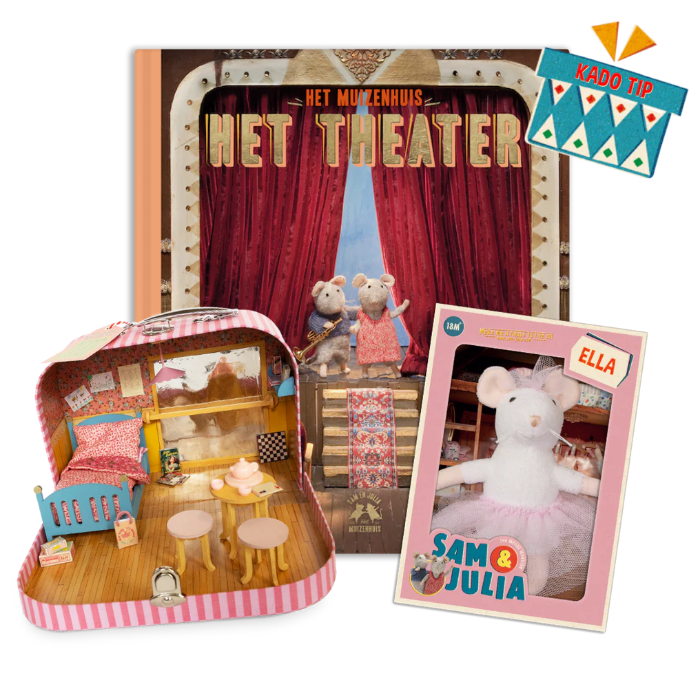 Met dit pakket koop je het complete pakket van Ella; het To Go speelkoffertje samen met het bijpassende knuffelmuisje en het boek Het Theater . Neem je knuffeltje overal mee naartoe in zijn eigen koffertje en bouw binnenin een gezellig mini kamertje. Zet de meubeltjes zelf in elkaar, voeg de schattige accessoires en papieren decoraties toe en creëer een fijn plekje voor je muis om uit te rusten. Hiermee is de beleving compleet als het boek wordt (voor)gelezen!